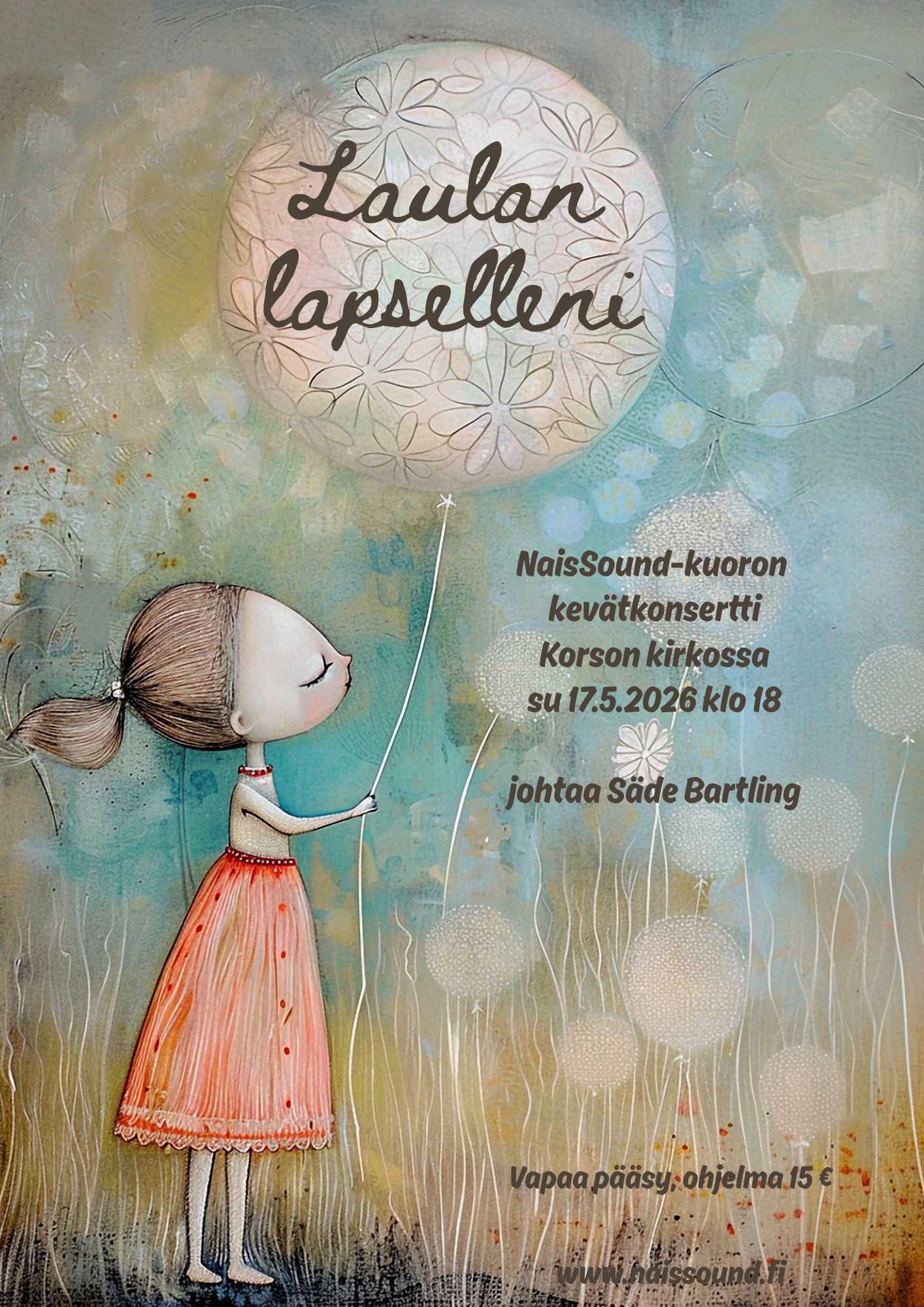Kenelle äiti laulaa, kun lapset ovat jo kasvaneet? Laulan lapselleni -kevätkonsertissa laulut kulkevat elämän eri vaiheiden mukana pienistä lapsista jo omille teilleen lähteneisiin. Konsertti sopii kaikenikäisille. Mukana myös soittajia. Konsertin johtaa Säde Bartling.
